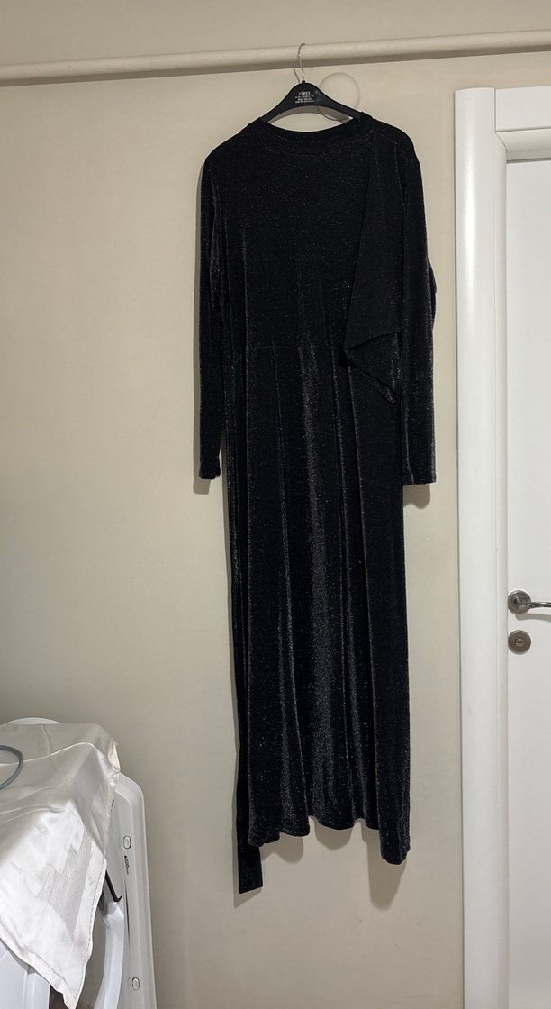 Siyah kendinden simli kumaş uzun kollu abiye elbise olarak kullandım özel dikim aynı kumaştan pantolon bluz ve üst tülü olarak takım da var isteyenlere onu da yardımcı olabilirim simler dökülme veya bulaşma yapmıyor bilginize.. elbise boyu 145 cm dir42 44 beden uyumludur ama 46 bedene de olur esnek kumaş ve fermuarı falan yoktur direk boydan giymelidir