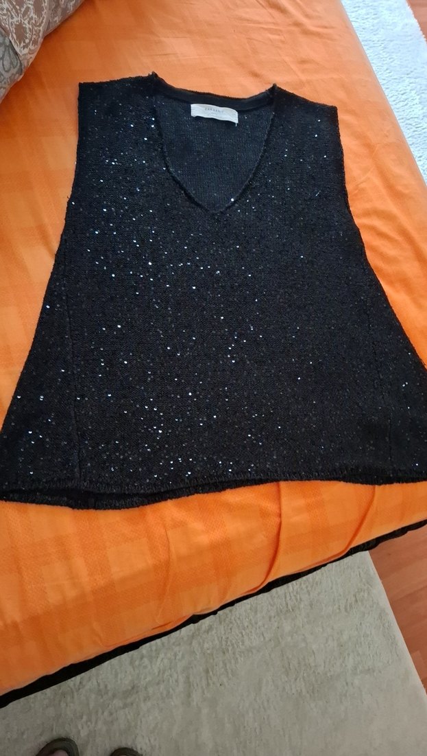 Siyah simli, V yakalı, kolsuz, sentetik kumaştan üretilmiş, bol kesim kadın süveter. Rahat dış mekan kullanımı için uygun. ✨