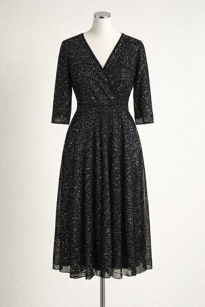 Siyah simli uzun abiye elbise, V yaka ve bol kesimdir. Parlak detayları ve askılı kollarıyla şık bir görünüm sunar. ✨