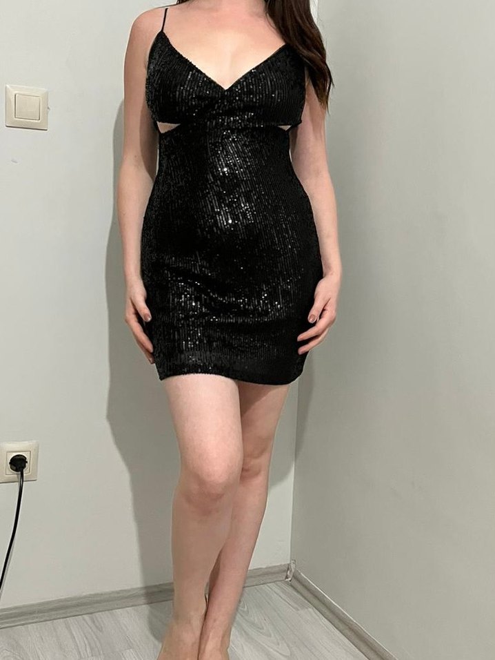 Siyah simli yılan desenli, V yakalı ince askılı, vücuda oturan mini elbise, romantik buluşmalar için cesur ve göz alıcı.