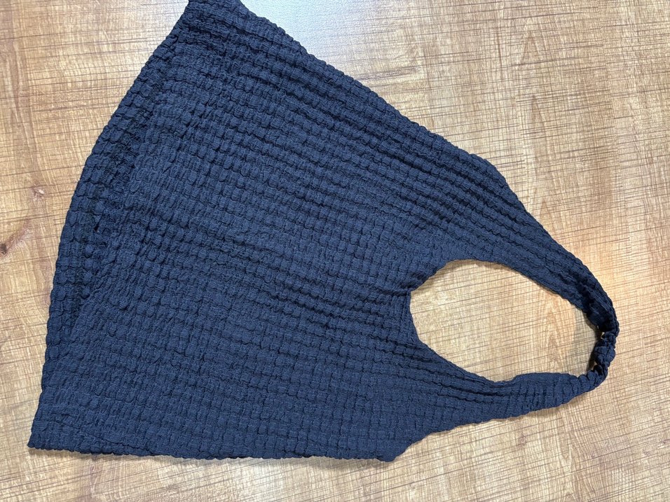 Siyah renkte, dokulu ve yumuşak kumaştan yapılmış, desensiz ve yuvarlak yaka açıklığına sahip bluz