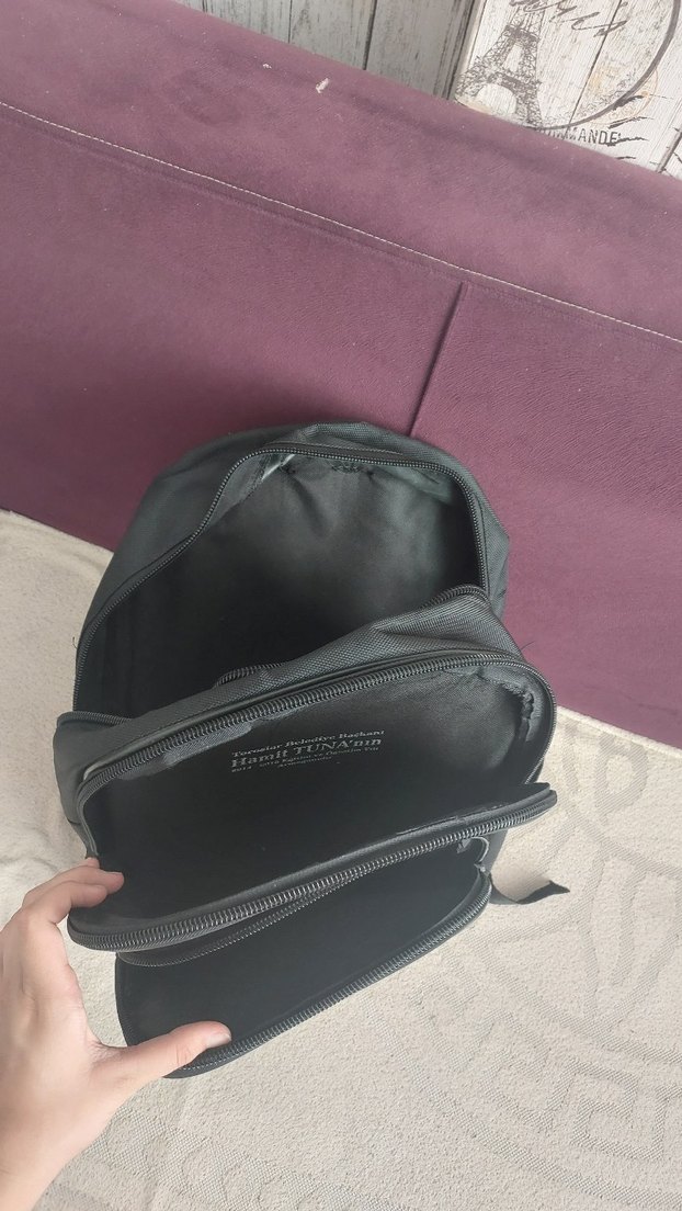 Siyah sırt çantası, düzenli saklama için çoklu fermuarlı bölmelere sahiptir. Dayanıklı kumaştan üretilmiştir.