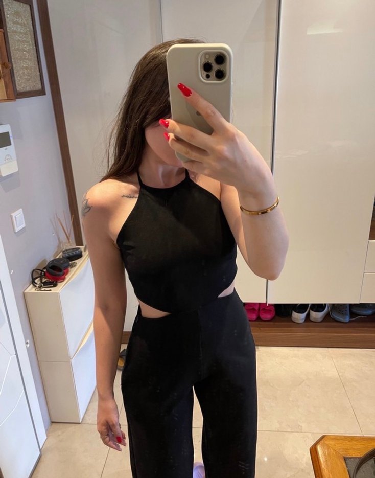 Yüksek yakalı, askılı kollu ve midi boyda, ipeksi dokulu siyah tulum. Sade ve şık tasarımıyla romantik akşamlar için ideal.