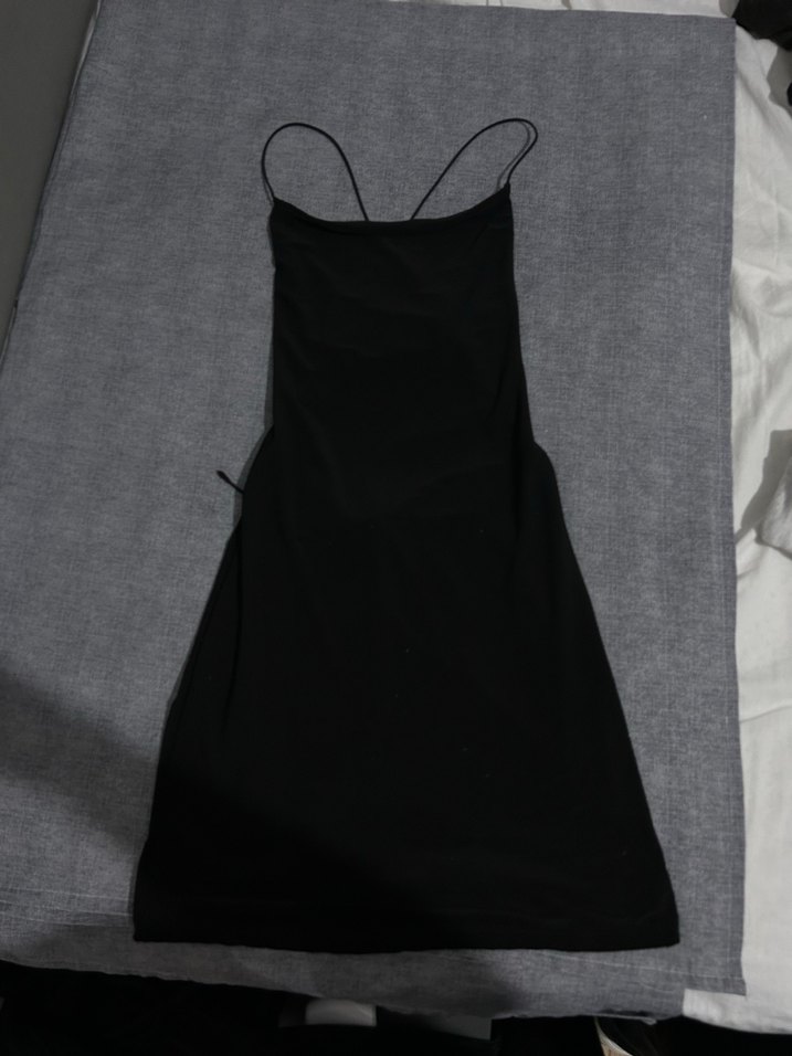 Siyah sırt dekolteli çapraz bağlamalı mini elbise
