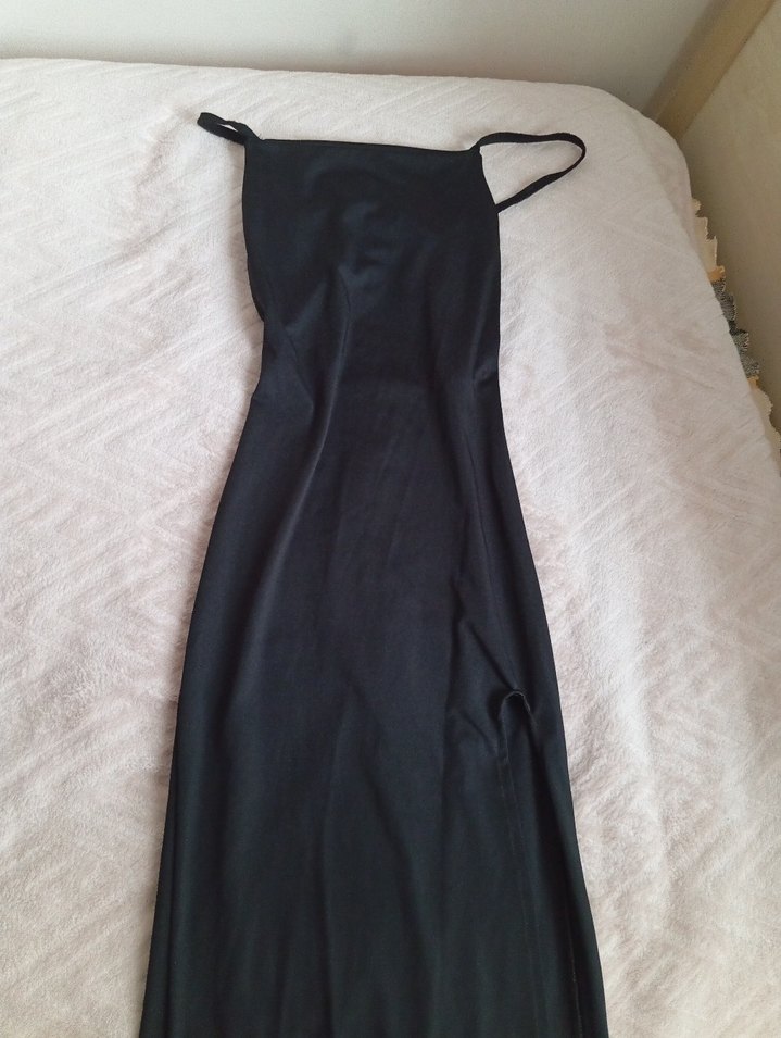 Siyah, ince askılı ve drapeli uzun elbise. İnce oturan kesimi ve satenimsi dokusuyla romantik akşamlar için uygundur. hiç bir kusuru yok 1 kere giyildi marka temsili
