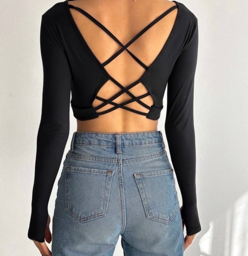 Siyah, uzun kollu, V yaka, sırtı kayışlı ve tokalı detaylara sahip, denim kumaştan dar kesim crop top. Günlük sokak tarzı için uygun.