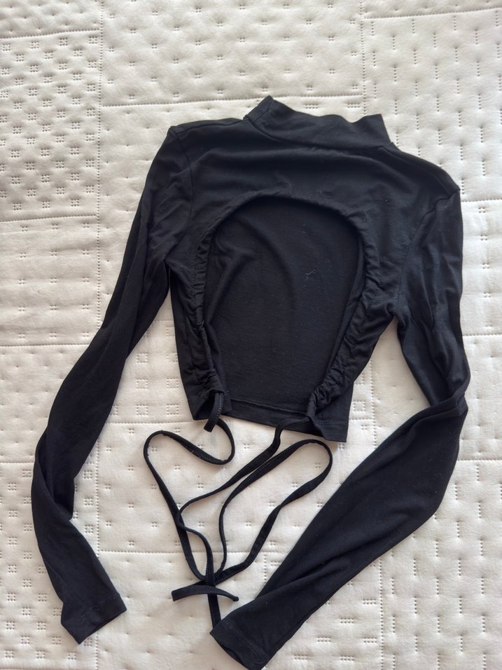 boğazlı ve uzun kollu siyah, vücuda oturan bluz. Sırada bağcıklı detaylar bulunur, günlük kullanım için uygundur. S beden diyor ama xxs ve xs bedene daha uygun aşırı dar çünkü.
