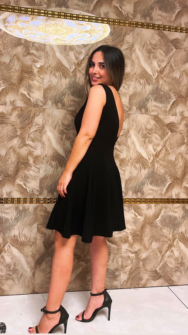 Siyah kumaştan, V yaka ve askılı kollu, elbisedir. Sırt detayı bulunmaktadır giriş tiril bir elbisedir