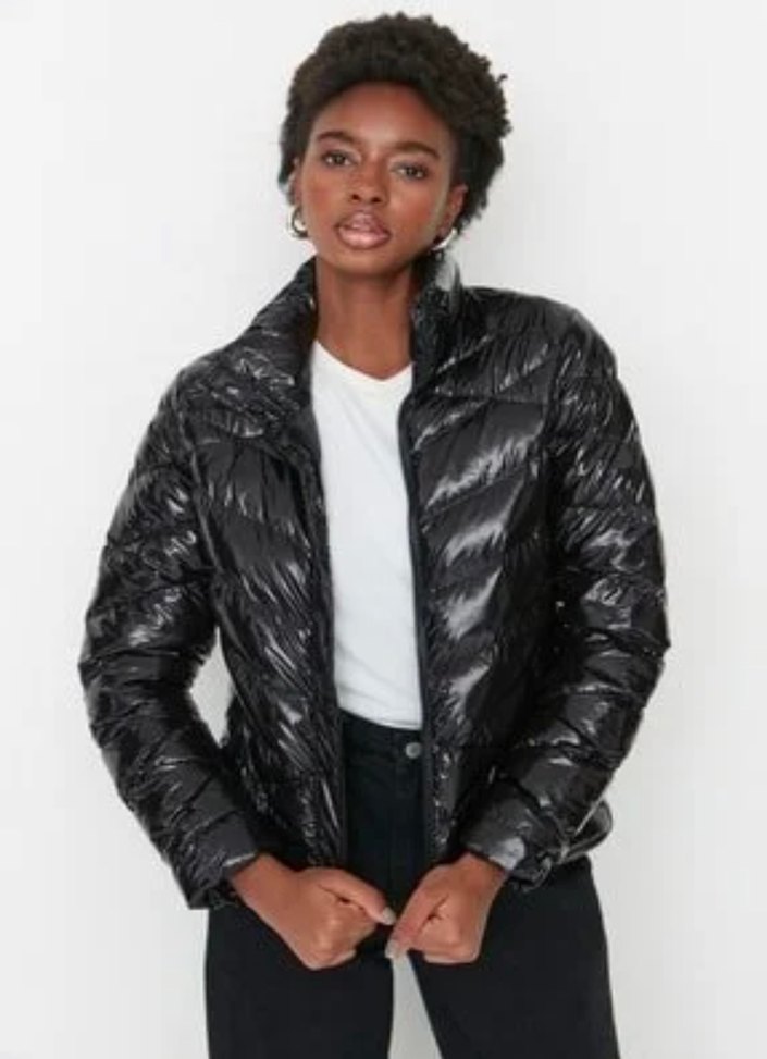 Siyah, şişme ve dik yakalı bu kadın montu, uzun kollu ve vücuda oturan kesimdedir. Sentetik kumaştan yapılmış, midi boyda ve desensizdir.