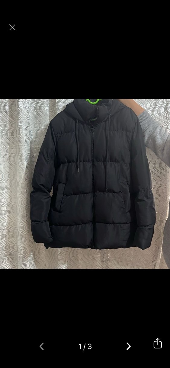 Yüksek yakalı, uzun kollu siyah şişme kadın kaban. Vücuda oturan, normal midi boyda ve yumuşak, sıcak kumaştan. Günlük sokak stiline uygun.