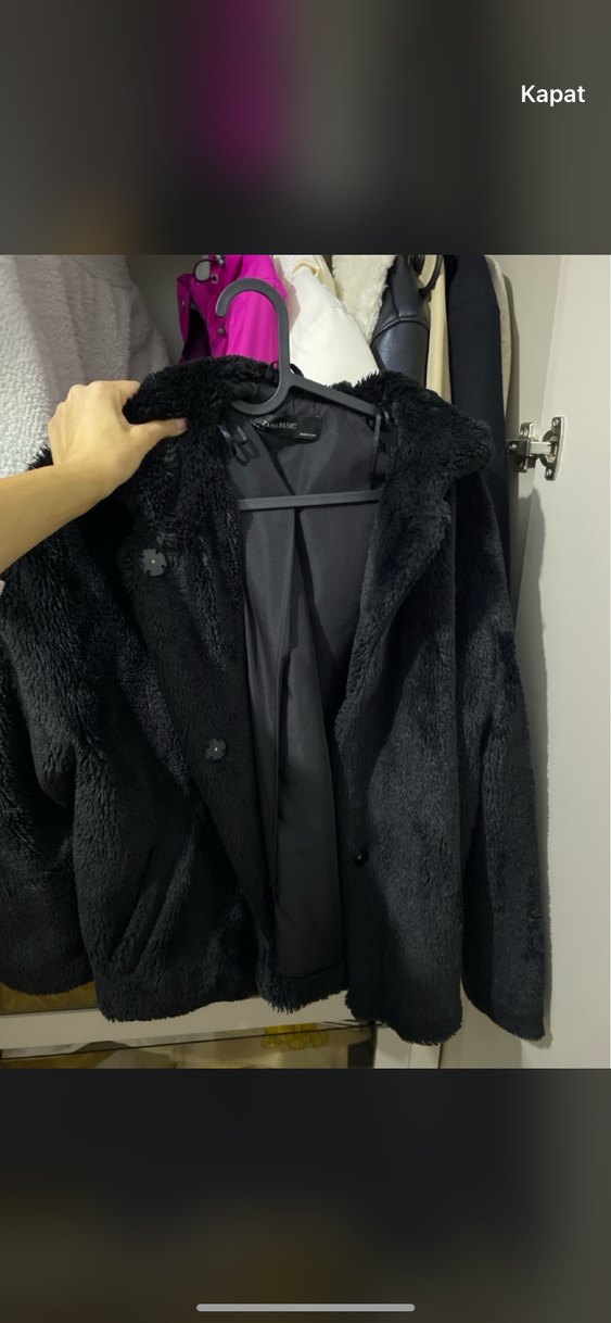 Siyah, bol kesim kadın kışlık mont, yüksek yakalı ve uzun kolludur. Yumuşak ve sıcak kumaştan yapılmış, şişme ve desensiz tasarıma sahiptir.