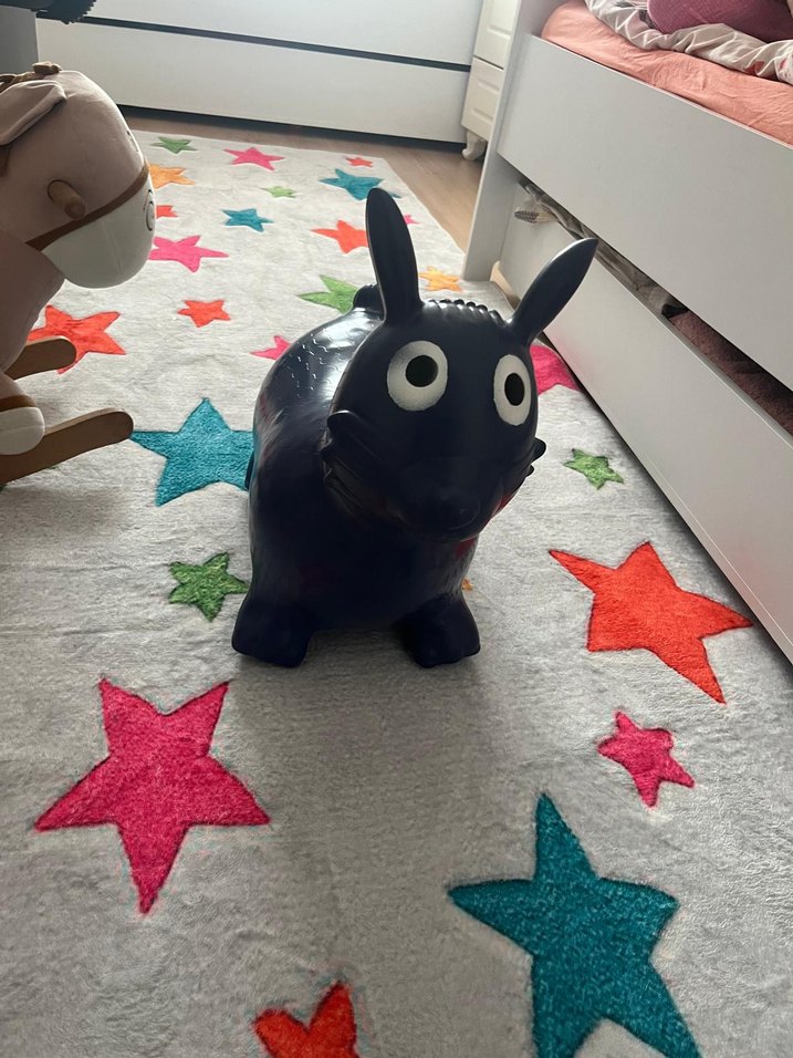 Büyük gözlere sahip, iç mekan oyunları için uygun siyah şişme tavşan oyuncak. Pürüzsüz ve parlak yüzeye sahiptir.