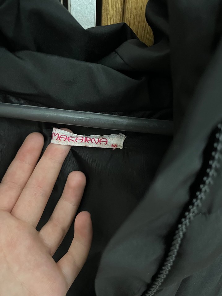 Makarnadan siyah, orta beden yelek Düz kumaş ve fermuar detayına sahip.