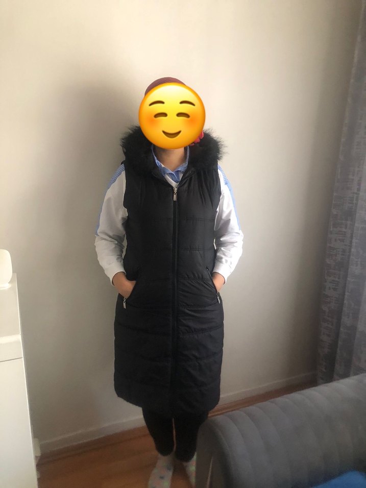 Yüksek yakalı, şişme tasarımlı siyah kolsuz yelek. Midi boy ve vücuda oturan kesimiyle günlük kullanıma uygun, sıcak tutan kumaştan üretilmiştir. Bir iki defa giyildi mevsimden dolayı gidilemedi ihtiyaçdan dolayı satılmakta hiç bir defosu yoktur