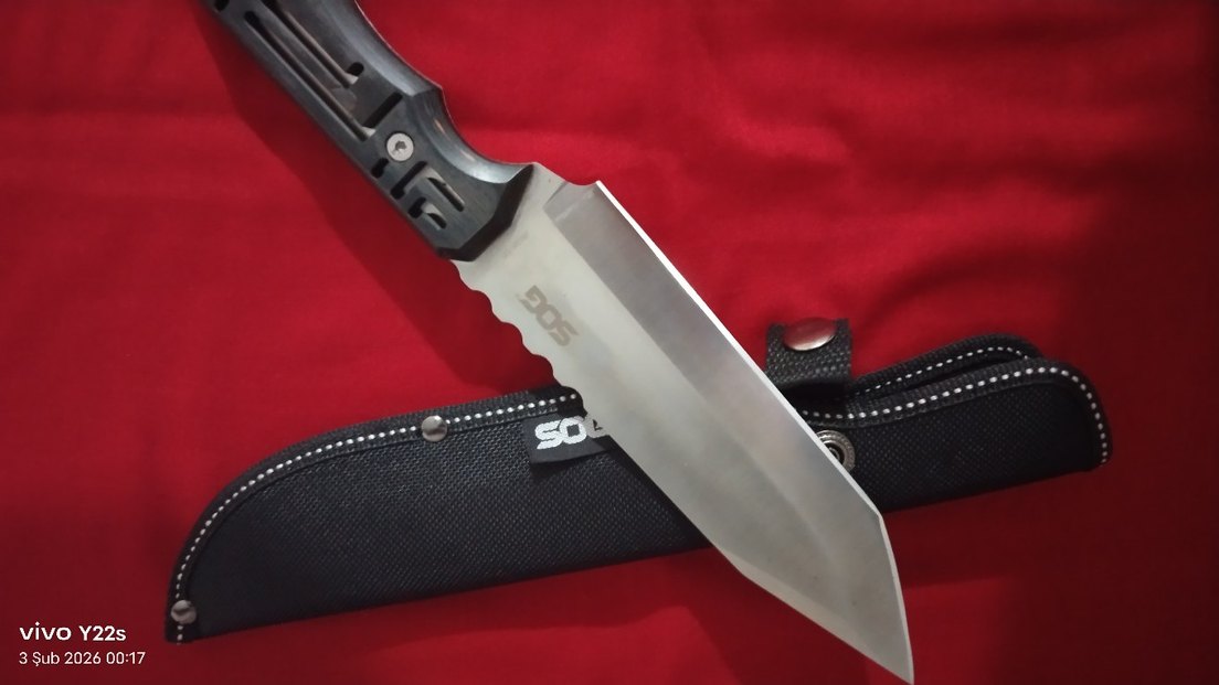 Siyah SOG bıçak, keskin dişli ve düz bıçak kenarına sahip olup dayanıklı siyah kılıfla birlikte gelir.