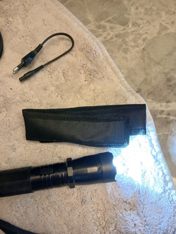 Şarj kablosu ve taşıma kılıfı ile birlikte siyah taşınabilir şok ve el feneri