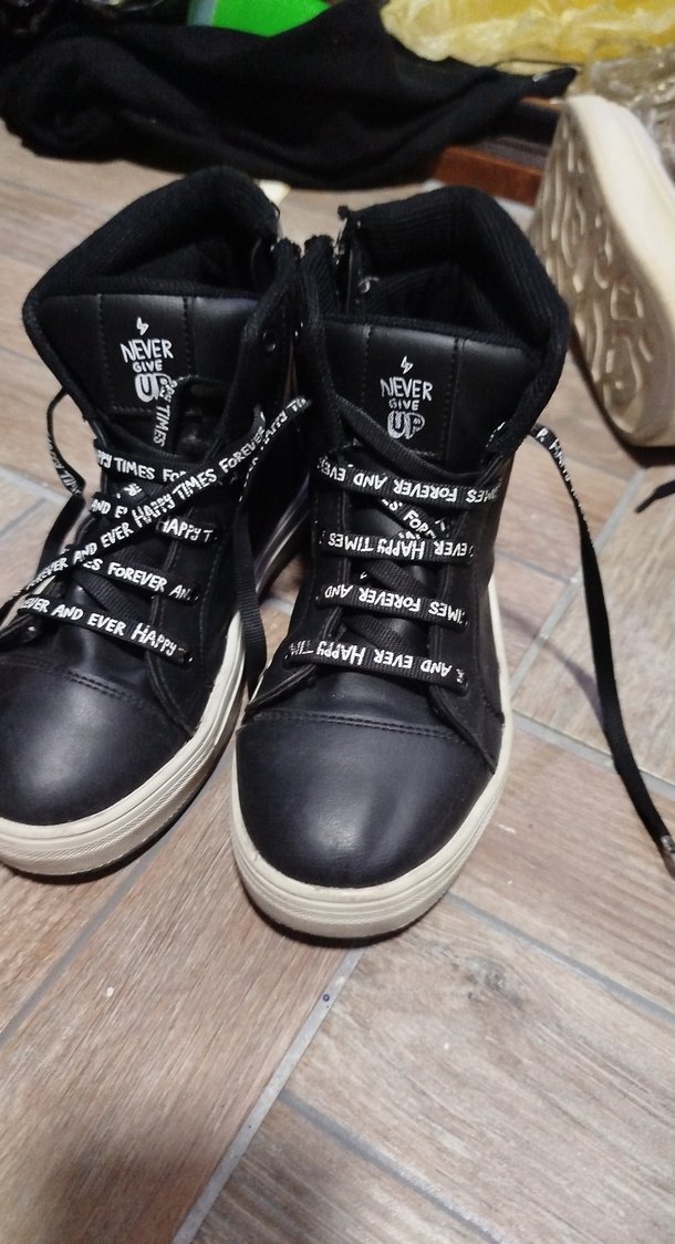 Siyah bağcıklar, beyaz yazılı sokak stili. "Never Give Up" gibi motive edici ifadelerle dikkat çeker.