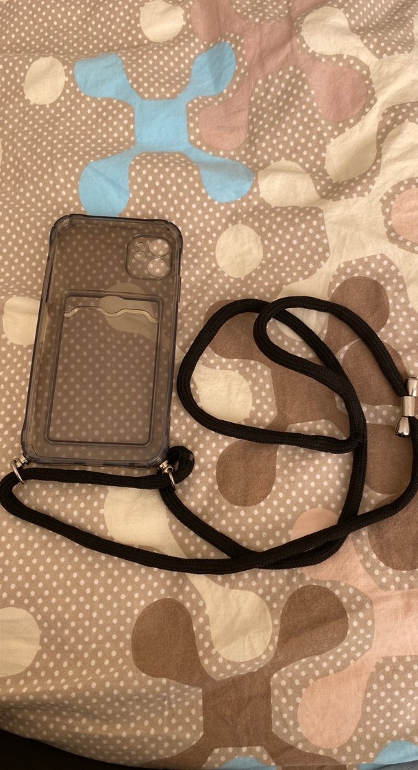 ve siyah ipi olan siyah sokak stili telefon kılıfı, kolay taşınabilirlik sağlar.