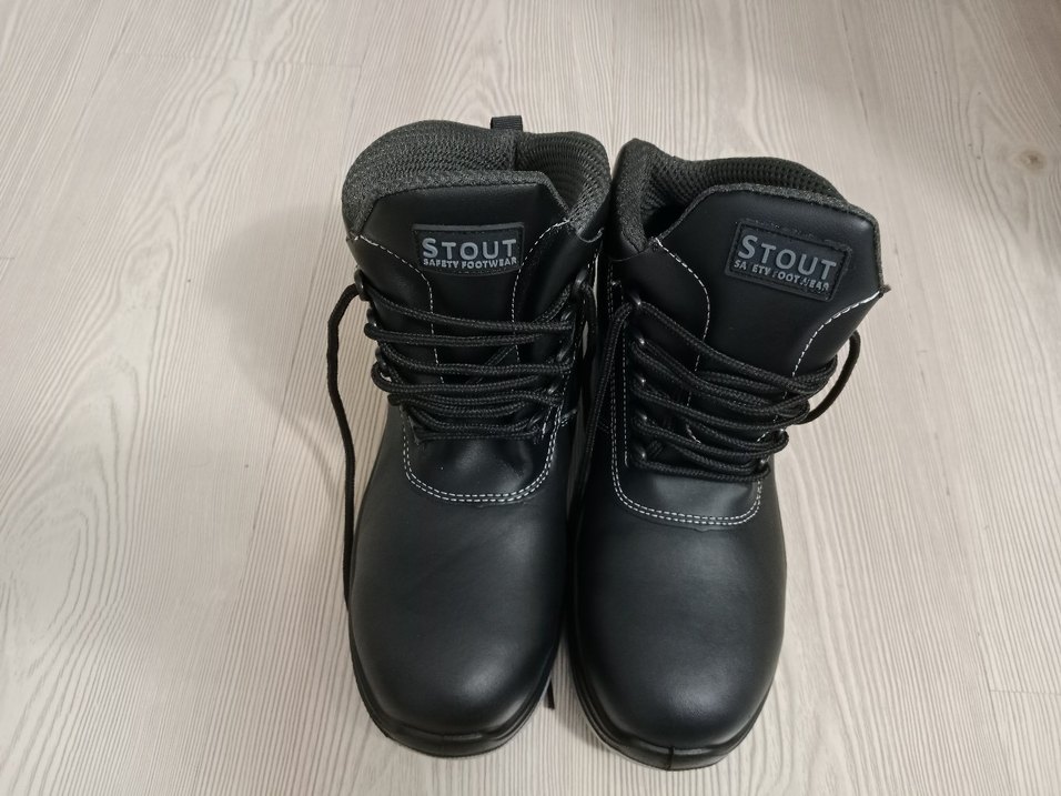 Siyah kauçuk erkek botları, tokalı kayışlarla sokak stiline uygun ve günlük kullanıma rahat. Üzerinde STOUT baskısı bulunur. uçları Demirli iş botu