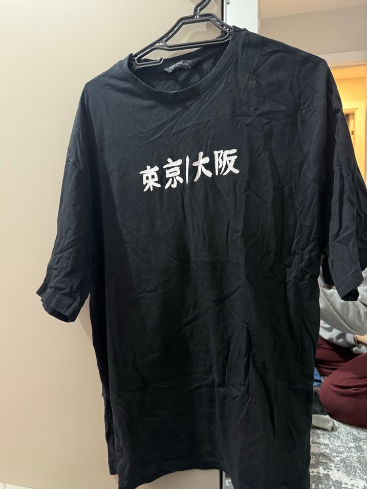 Siyah renkte, kısa kollu, yuvarlak yaka ve bol kesim tişörtü. Baskılı deseniyle sokak stiline uygun, günlük kullanım için rahat ve şık.