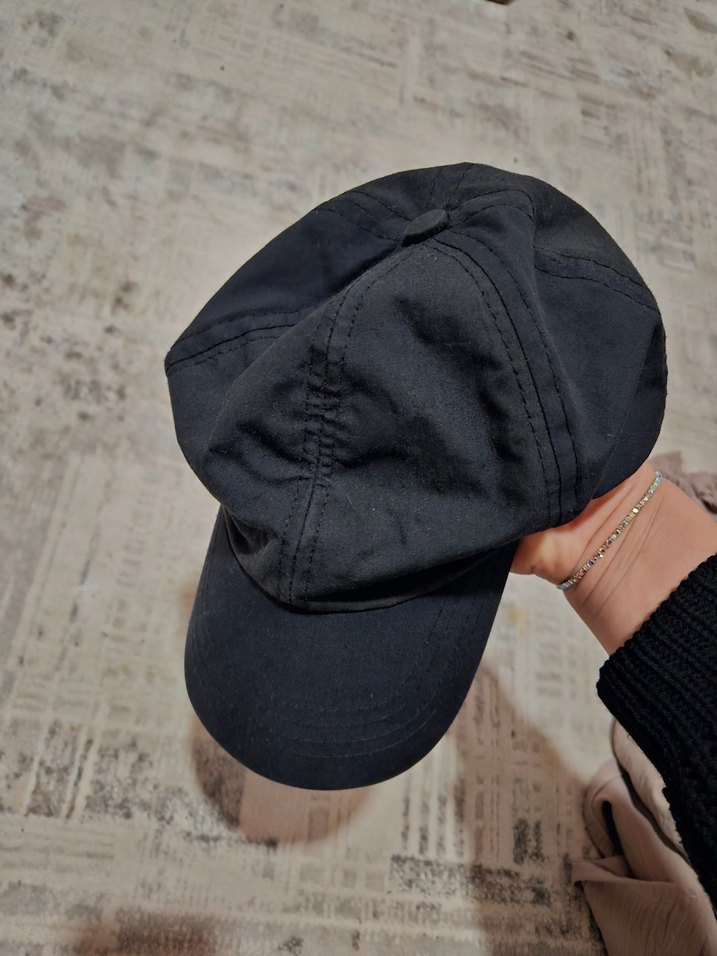 Siyah renkte, sentetik kumaştan üretilmiş sokak stili kadın şapka, rahat ve şık bir görünüm sunar. renginde hafif solma var
