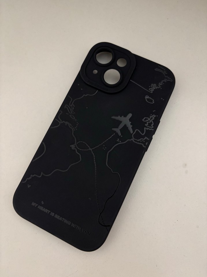 Siyah telefon kılıfı, sokak stili ve sade uçak deseni ile birlikte 'MY HEART IS BEATING WITH YOU' yazısı bulunuyor. ✈️ İphone 15 için uygundur.