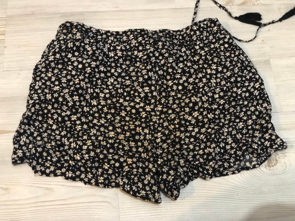 Siyah çiçek desenli, volanlı ve bağcıklı bol kesim hamile şortu. Yumuşak sentetik kumaştan, bohem tarzı için uygun. Sayılı kullanım temiz ürün