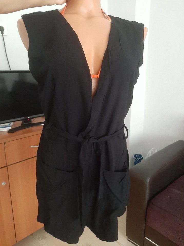 Hiç kullanılmadı, ipeksi penye kumaştan, kuşaklı, ön cepleri ve arkası fermuarlı şort tulum.