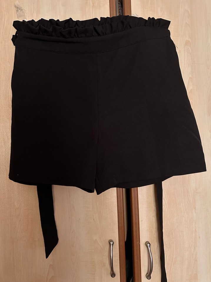 Siyah bol kesim ve kemerli bel detaylı mini şortu, günlük kullanım için sade tasarıma sahiptir.