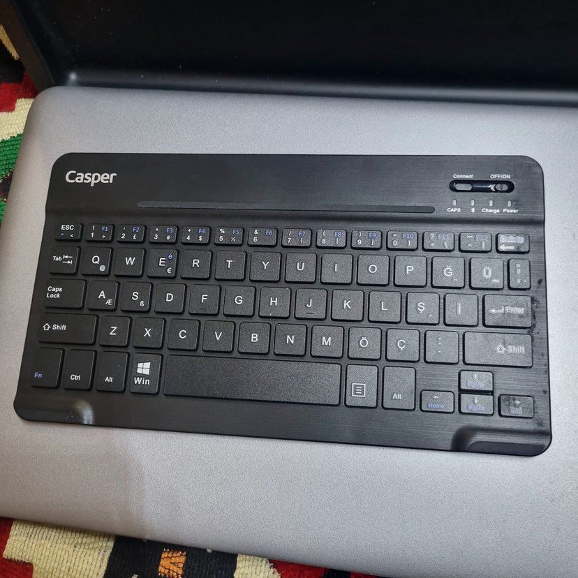 Siyah casper kablosuz klavye, koyu renk tuşlar ve standart düzen, fonksiyon tuşları ve sayısal tuş takımı ile birlikte. ️