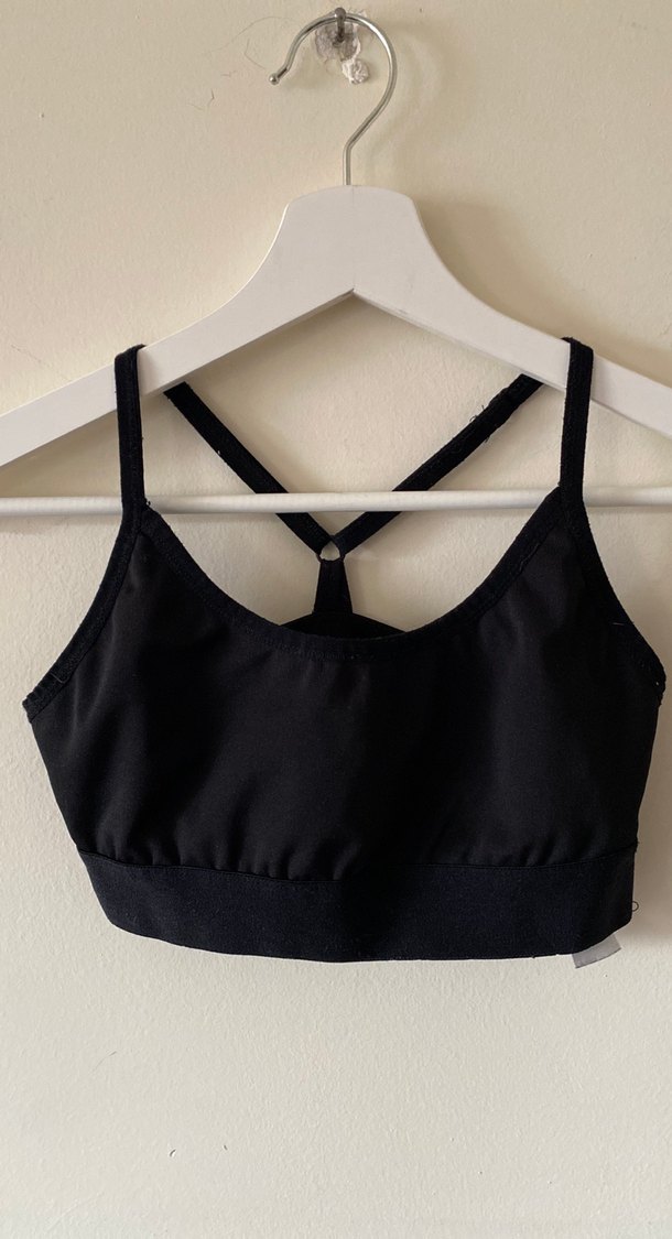 Sade tasarımlı, arkası çapraz askılı siyah spor büstiyer, normal boyda. Streetwear tarzı için uygun.