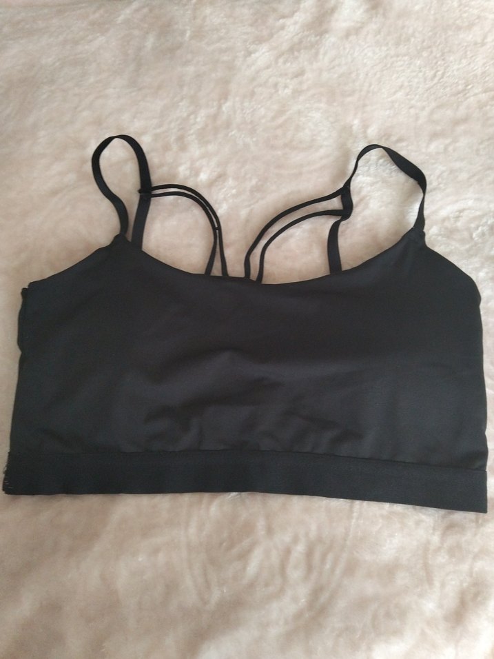Siyah spor tarzı, gotik stil çift ince askılı, rahat kesim ve düz dokulu bir büstiyerdir. Normal uzunluktadır. kenarında minik bir defosu var kullanıma engel değil