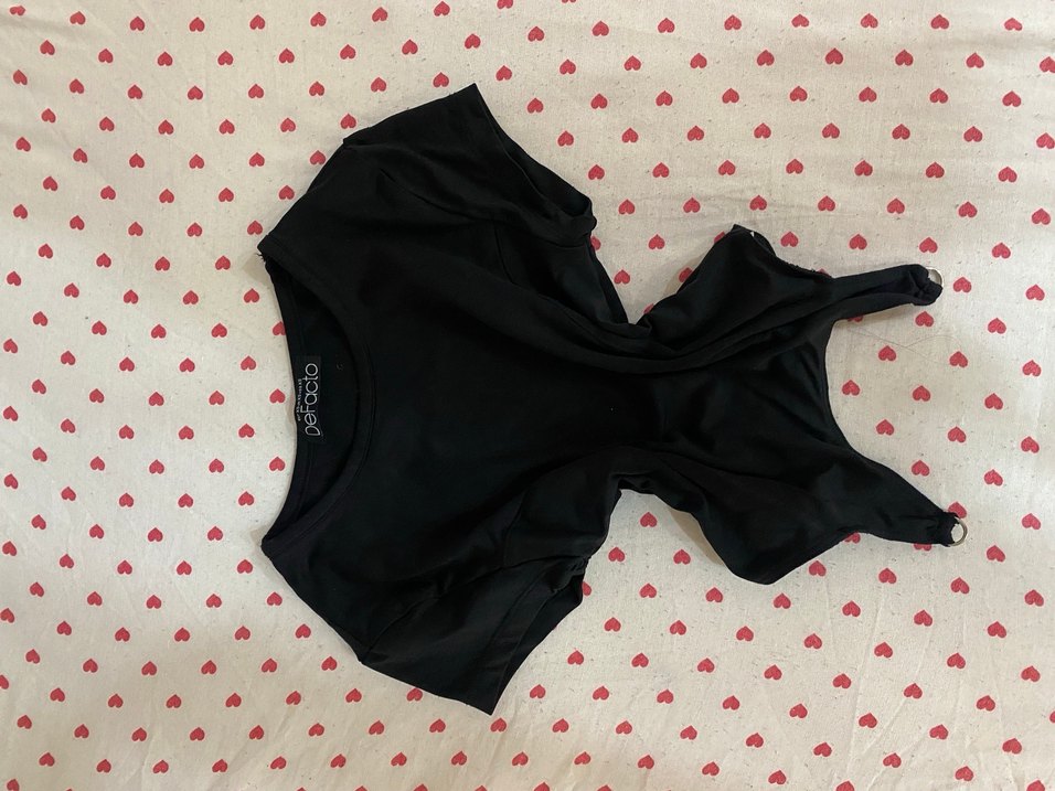 Siyah renkte, spor yaparken giyilir rahat body top ve kısa kesim bluzu. Yumuşak sentetik kumaştan, gotik tarzda, rahat ve şık strappy kollu tasarım, günlük kullanıma uygun.