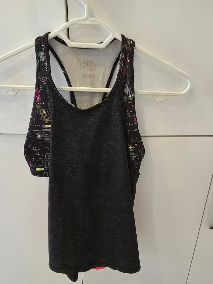 Siyah, baskılı sentetik kumaştan, straplez yaka ve yapışkan bant detaylı, spor ve sokak tarzına uygun, dar kesim kız çocuk askılı atlet 8-10 yaş . ♀️
