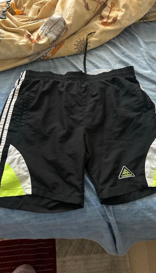 Siyah renk, sentetik kumaş ve Velcro detaylı erkek spor şortu. Rahat kesimi ve neon beyaz detaylarıyla sportif ve günlük kullanıma uygun.