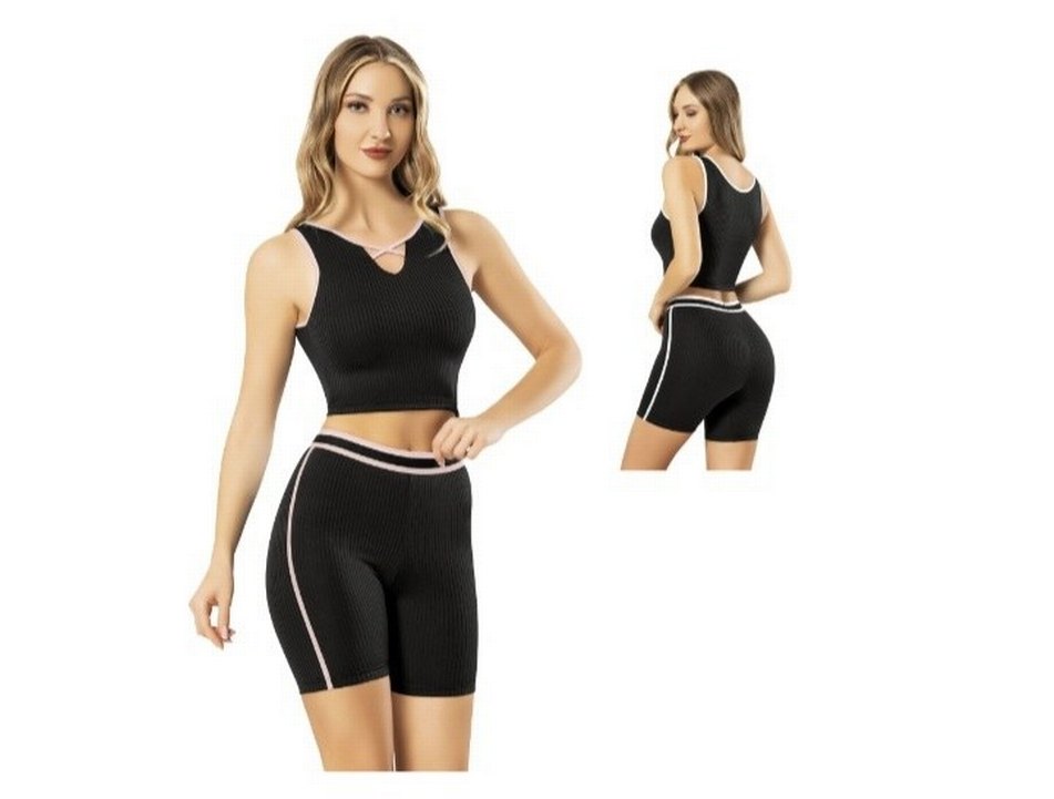 Siyah renkli, elastik bel detaylı, kolsuz crop top ve yüksek bel kısa tayt takım. Cesur sokak stili için uygun.