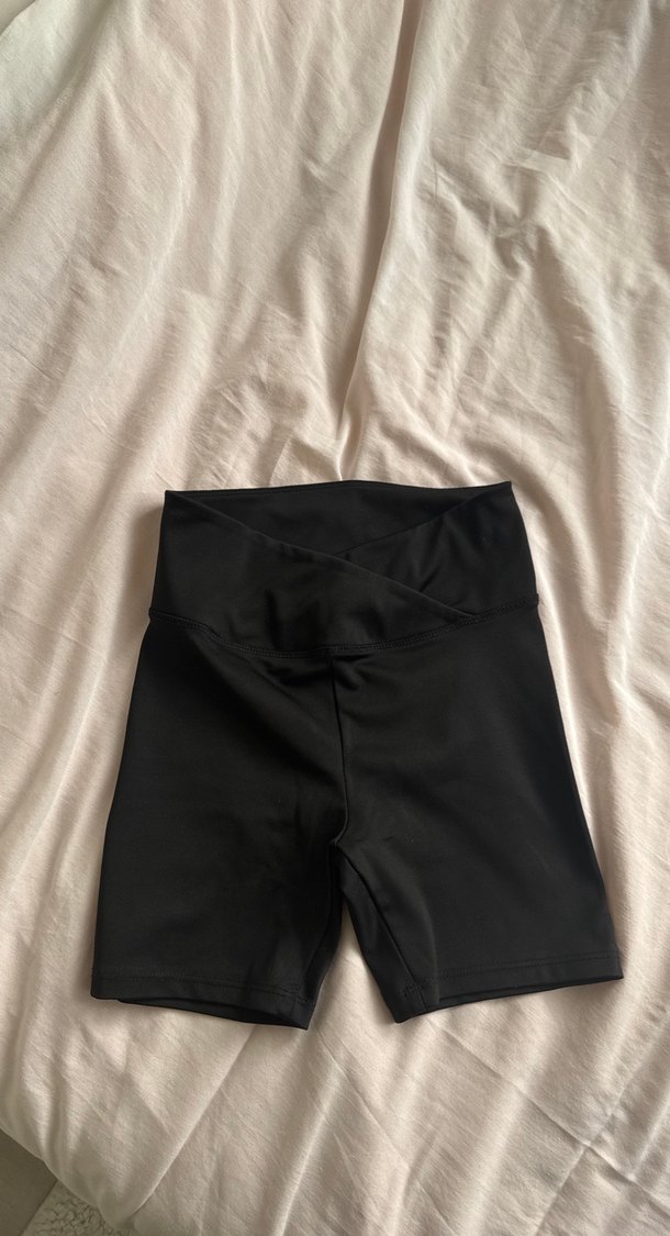 Düz siyah, midi boy, spor şortu. Yumuşak sentetik kumaştan, rahat ve şık, spor için uygun.