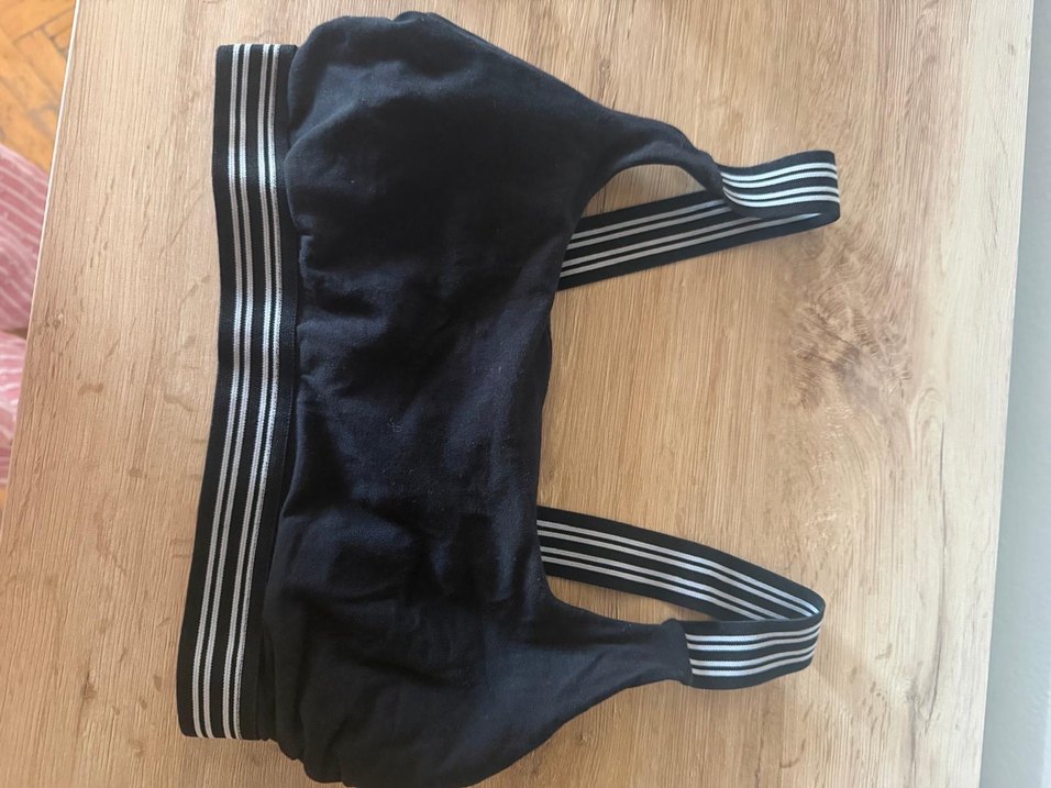 Siyah spor sütyeni, çizgili elastik askılarla normal boyda ve desenizdir. Streetwear tarzına uygun rahat destek sunar.