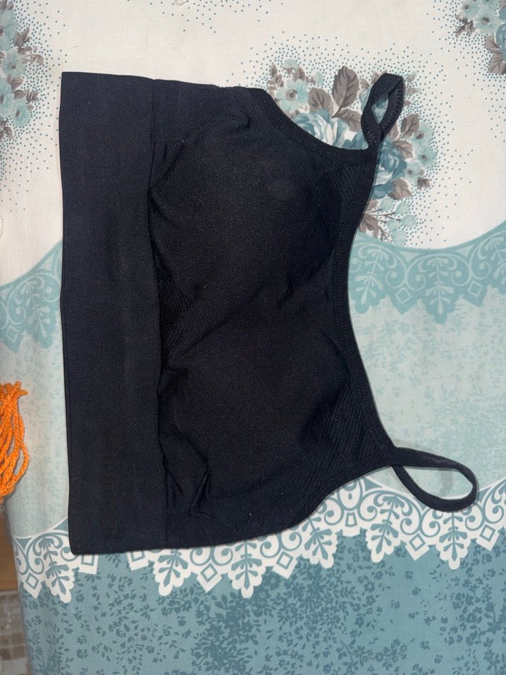 Siyah renkli, midi boyda, desensiz spor sütyeni. İnce askıları ve rahat yapısıyla streetwear tarzına uygundur. Kalıbı dar