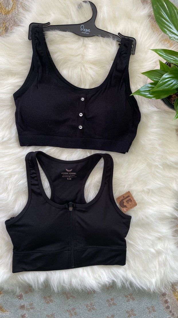 Siyah spor sütyenleri, normal midi boyda, biri düğmeli diğeri fermuarlı detaylı. Athleisure ve sokak stili için uygun.