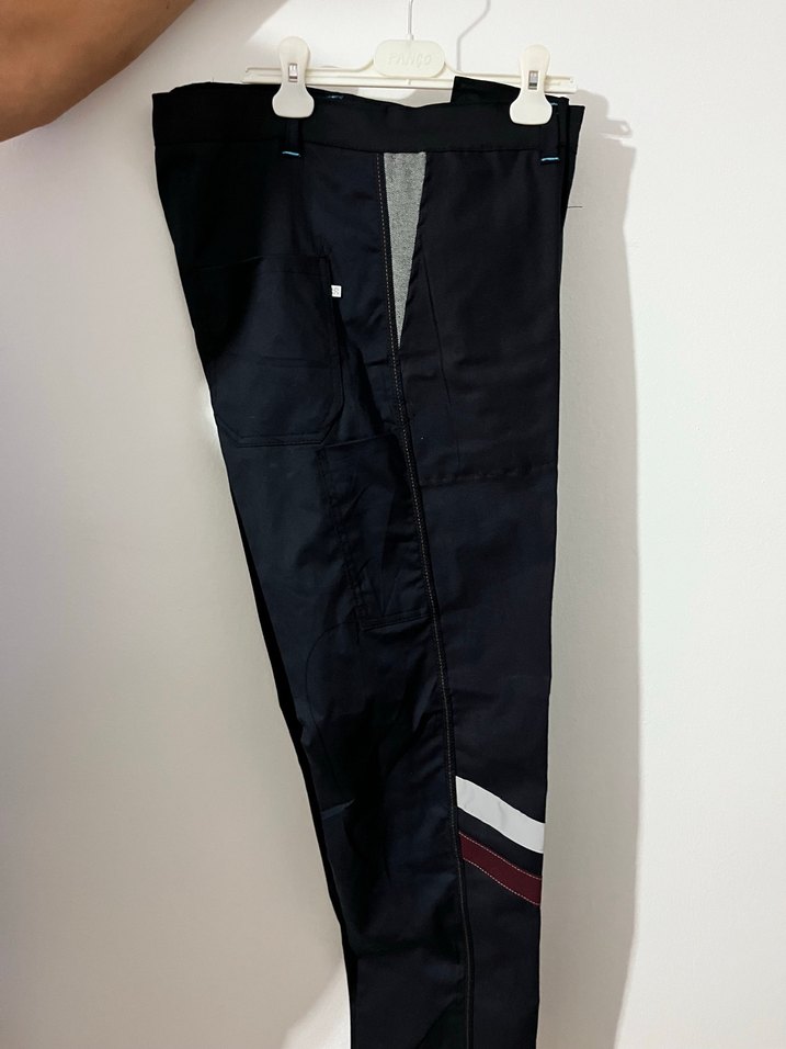 Siyah, uzun boy, sentetik kumaştan yapılmış erkek pantolonu. Kemerli ve bacakta şerit renk detayları bulunur, günlük kullanıma uygundur. Çalışma ortamında giyilmeye uygundur sıfır üründür 56 bedendir