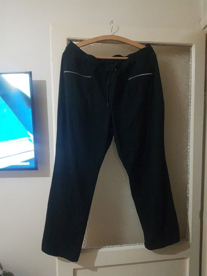 Siyahyumsak kumaştan, fermuarlı cepli, bol kesim kadın pantolon. uzun boy ve spor tarzıyla günlük kullanıma uygun bel tek tarafli 53 butunlemesine 106 cm esnetildiginde butunlemesine 120 cm sayili kullanildi sanirim almanyadan alindi 1xs yaziyor kalip buyuk yepyeni belinde ipi mevcut pacadada ip detay var olcuye gore aliniz