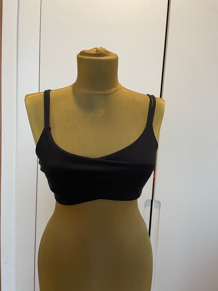 Siyah, goth tarzı sporcu sütyeni, desen içermeyen sade tasarımı ve normal uzunluğu ile rahat kullanım sağlar.