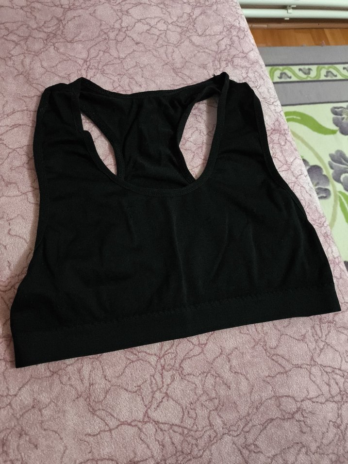 Siyah sporcu sütyeni, sırt kısmı racerback tasarımlı, desensiz ve goth stilinde. Rahat ve kullanışlı athleisure ürünü.