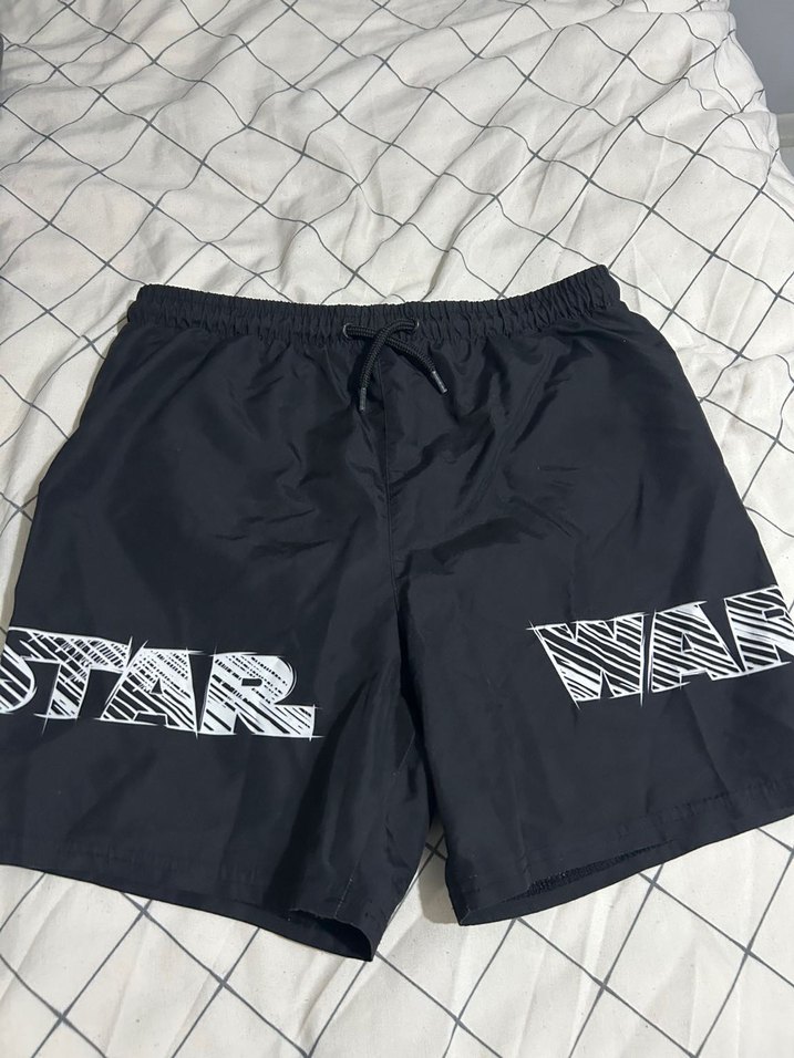 Siyah, bol kesim Star Wars baskılı mini erkek deniz şortu, plaj için rahat ve şık bir tercih. 11-12 yaş erkek çocuk