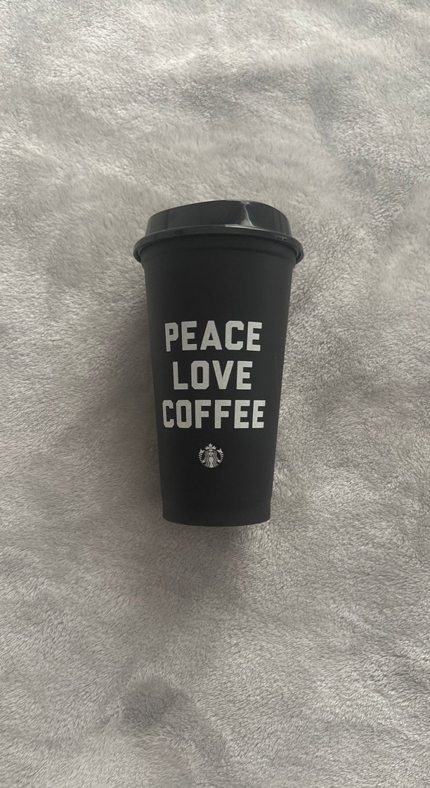 Siyah renkte, kapaklı Starbucks kahve kupası üzerinde beyaz 'PEACE LOVE COFFEE' yazısı bulunmaktadır. ☕Cok kullanimliktir
