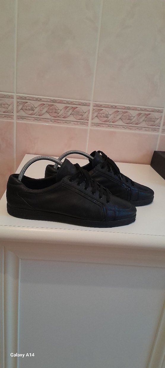 Siyah renkte, deri malzemeden yapılmış spor ayakkabısı. Spor ve rahat günlük stil için uygun, şık ve sade tasarım