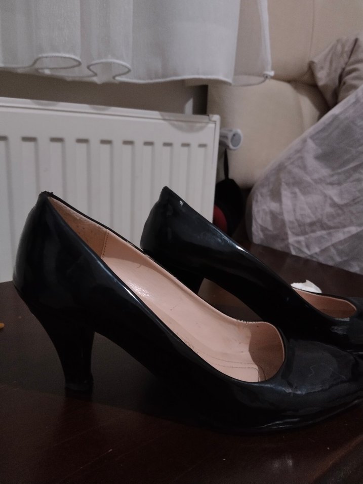 Rugan parlak siyah, klasik gotik tarzda, kauçuk malzemeden yapılmış stiletto topuklu ayakkabılar. Ofis kullanımı için uygun, desensiz şık tasarım.