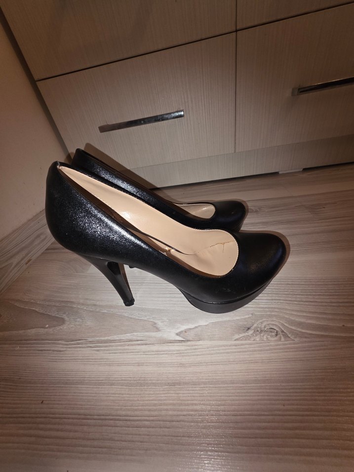 Siyah lastik malzemeden yapılmış, tokalı klasik stiletto topuklu kadın ayakkabısı. Ofis için uygun, gotik tarzda cesur bir tasarıma sahiptir.