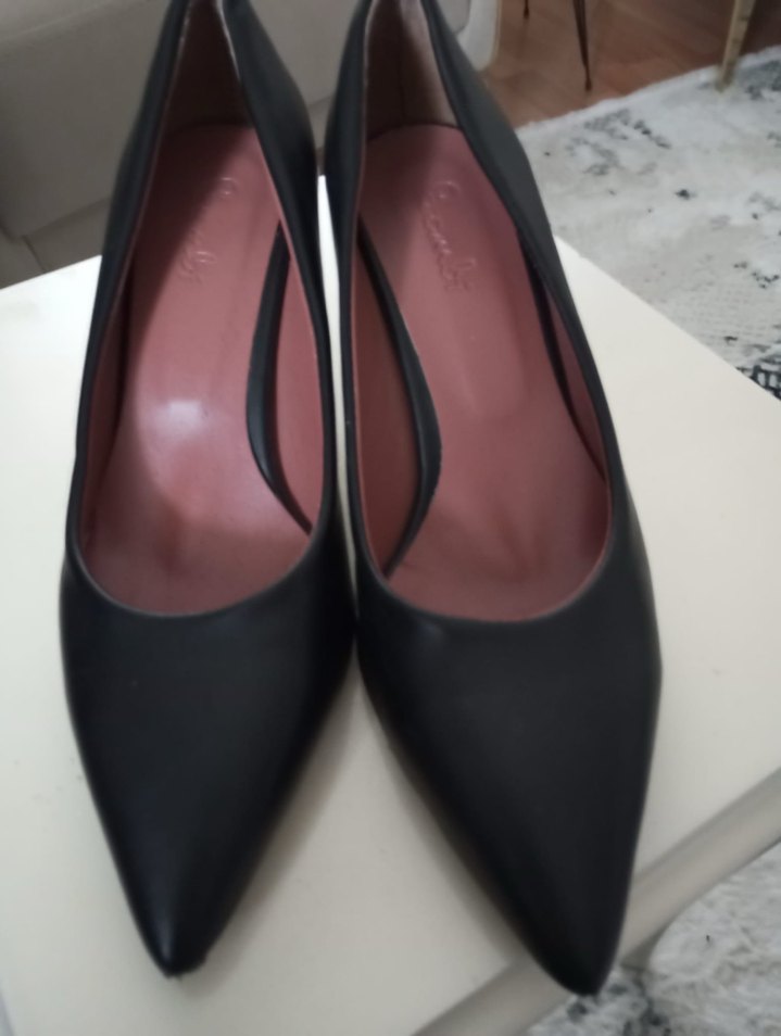 Siyah, lastik malzemeden yapılmış, desen içermeyen stiletto topuklu ayakkabılar, klasik ve gotik tarzı ofis şıklığıyla buluşturuyor.